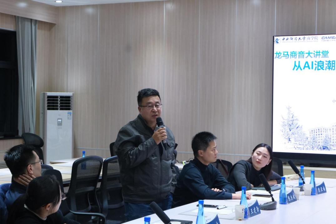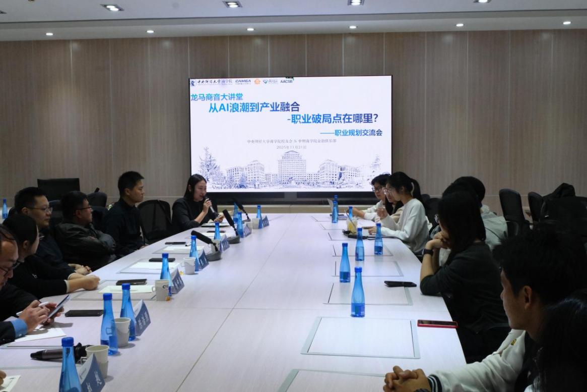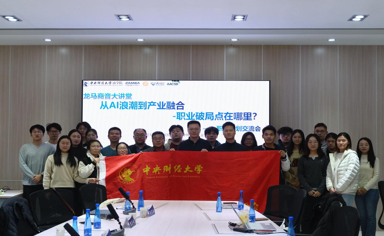 2025年11月21日,我校商学院校友返校品牌活动“龙马商音大讲堂”如期举行。此次“从AI浪潮到产业融合,职业破局点在哪里”主题职业规划交流会由中央财经大学校友总会商学院分会主办、商学院金融俱乐部承办。商学院党委副书记、关工委主任杨中英,办公室主任孙翔以及商学院不同届别、专业及职业的校友与在校本硕博学生30余人参加了本次活动。