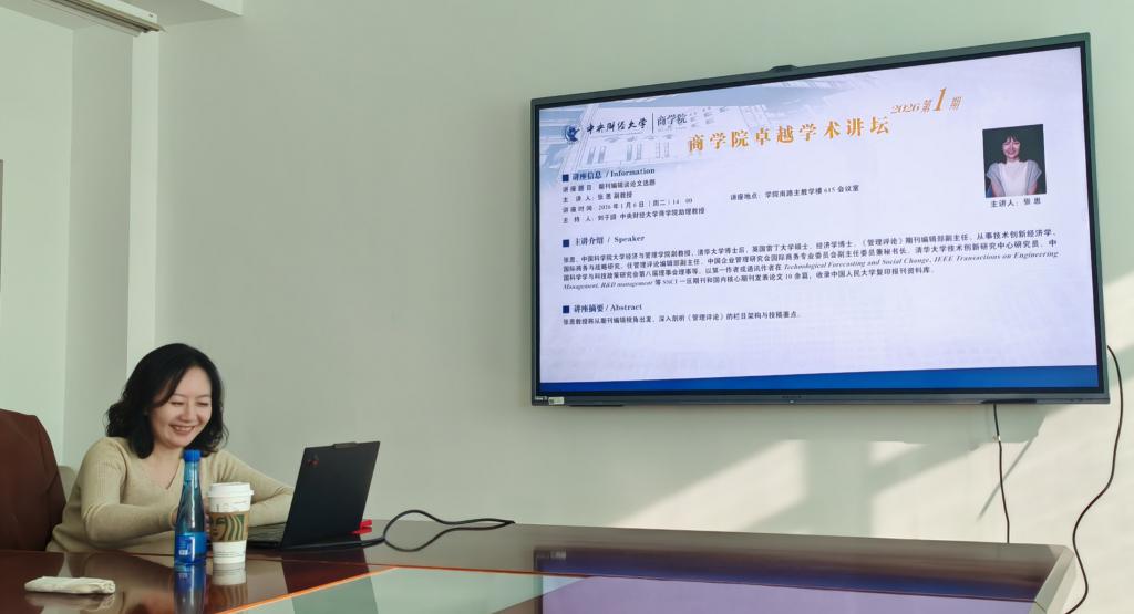 2026年1月6日(周二)下午2点,中央财经大学商学院在学院南路校区主教学楼615会议室顺利举办了2026年第1期卓越学术讲坛。本次讲座特邀中国科学院大学经济与管理学院副教授、《管理评论》编辑部副主任张思担任主讲嘉宾。商学院的教师、博士生、硕士生以及其他高校的学者共计10余人参加了此次学术活动。讲座由中央财经大学商学院助理教授刘子謂主持。活动伊始,刘子謂助理教授向与会者介绍了张思副教授的学术与编辑背景。张思副教...