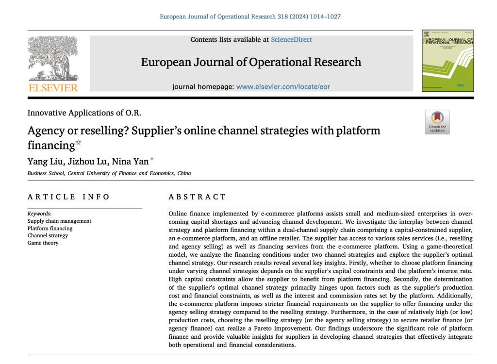 Recently, under the guidance of Professor Nina Yan and Associate Professor Jizhou Lu from the Department of Supply Chain and Operations Management, Liu Yang, a PhD student, has published an academic paper as the first author in the flagship journal in the field of operations management, European Journal of Operational Research (EJOR), entitled ‘Agency or Reselling? Agency or Reselling? Supplie...