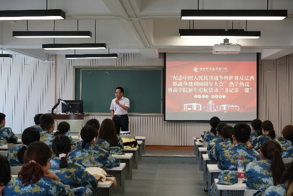 9月3日,纪念中国人民抗日战争暨世界反法西斯战争胜利80周年大会在北京天安门广场隆重举行。商学院组织全体2025级本科新生集体观看并开展热学热议活动。商学院党委书记李跃新与新生一同热议庆祝大会,为同学们科普二战知识。随后,李书记就家国情怀为主题为同学们讲授“书记第一课”,李书记将家国情怀具象化,深入浅出地讲述了家国情怀在生活中的体现,强调责任与担当对于新时代青年的重要性。