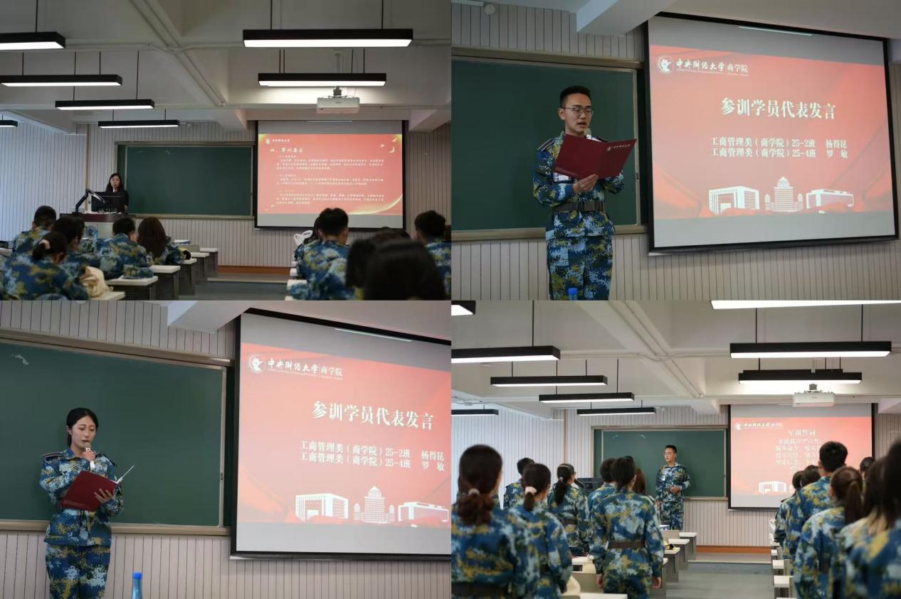 商学院高度重视本科生军训工作,9月3日组织开展军训动员会及开营仪式,商学院党委书记李跃新、全体2025级本科新生参会。2025级本科生辅导员王惠婷为同学们讲解军训意义、要求,展示往届军训风采,同学们通过图片和视频直观感受到军训生活的精彩。同时两位参训代表也讲述了自己对军训的理解,并带领了全体25级本科生发出军训宣誓。