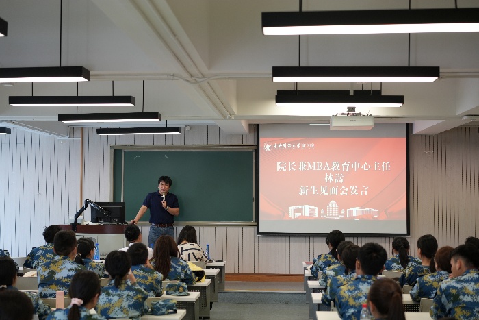 院长兼MBA教育中心主任林嵩对新生的到来表示热烈欢迎,林院长详细介绍了学院并寄语同学们。林院长希望同学们能够尽快适应大学生活,找到自己的热爱并一直坚持下去。林院长还建议同学们要锻炼好身体,坚持运动,养成良好的生活习惯,为未来持久的工作和学习提供动力。