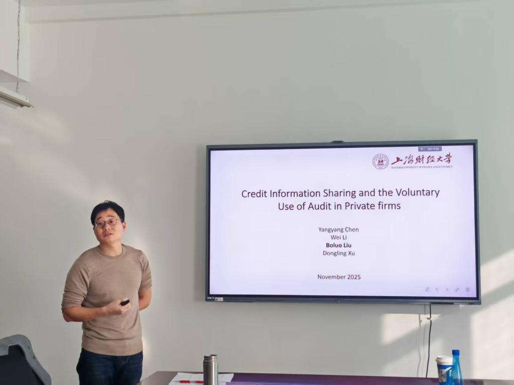 刘波罗副教授本次讲座的主题为“信用信息共享与私营企业自愿使用审计行为”。他基于55个国家公司层面的大规模数据,实证考察了公共信用登记制度(Public Credit Registries, PCRs)对私营企业自愿聘请外部审计的影响。研究发现,公共信用登记制度的建立显著提升了私营企业对审计服务的需求。其核心机制在于,审计能够帮助企业更充分地利用公共信用登记带来的信息共享收益,即以更低成本、更优条件获得外部融资。研究采用公共信用登记制度启动作为外生冲击的识别策略,提供了严谨的因果推断证据。刘教授的研究揭示了金融市场重要制度(公共信用登记)与企业自愿性财务报告行为之间的互动关系,为理解信用基础设施如何激励高质量会计信息生产提供了新视角。