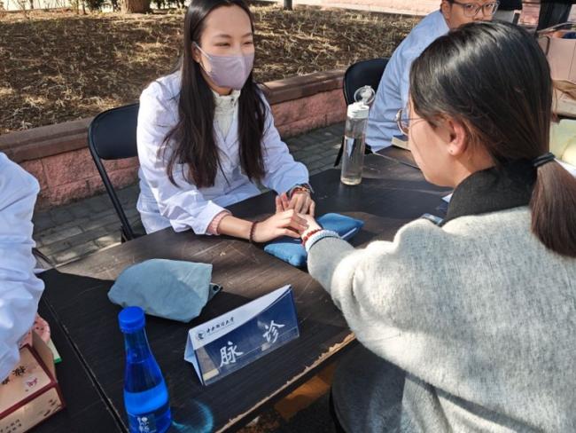 活动现场,来自北京中医药大学的专业志愿者团队,带着对中医的热爱与扎实的专业知识走进校园,为中财师生带来手诊、耳针、脉诊、推拿四大特色中医服务。活动现场人头攒动,气氛热烈,同学们在春日暖阳里有序排队,沉浸式感受传统中医药文化的独特魅力。