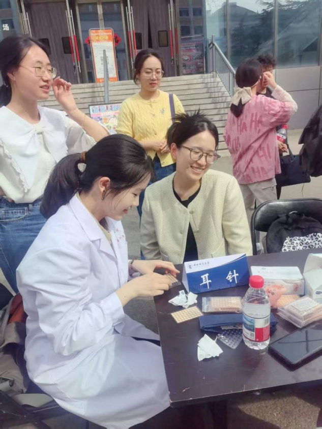 耳针区域格外受欢迎,志愿者们依据中医耳穴理论,通过按压或贴压刺激穴位,帮助同学们缓解疲劳、肩颈僵硬与睡眠不佳等问题,不少同学体验后都直呼“轻松了不少”。
