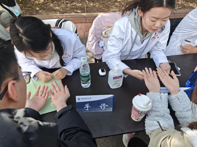 手诊台前,志愿者们仔细观察掌色与纹路,结合中医经络理论为同学们分析健康状态,给出个性化的作息建议与健康提示,让大家从掌心的细微变化中,读懂身体发出的健康信号。