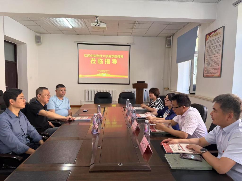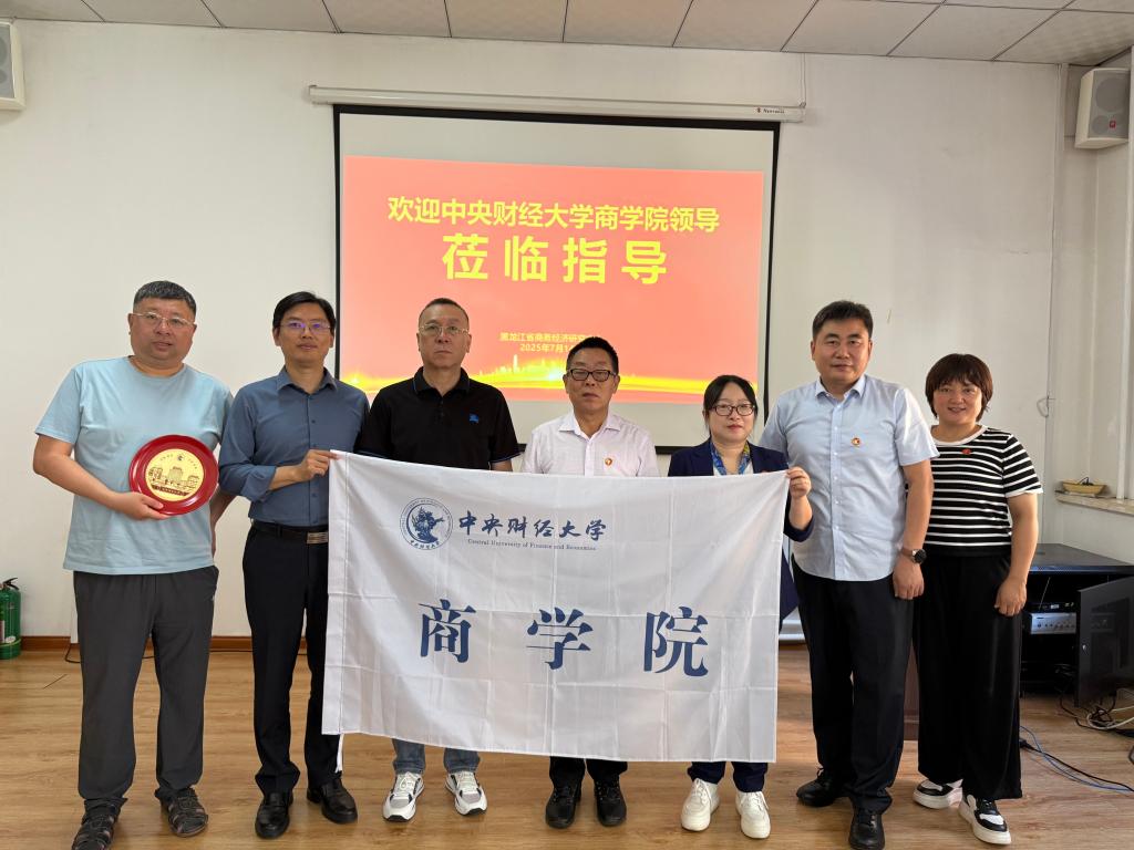 2025年7月14日,中央财经大学商学院党委书记李跃新、党委副书记杨中英、MBA学生工作部主任孔伟明、商学院研工办主任齐岩一行走访黑龙江省商务经济研究中心,看望在黑龙江省商务经济研究中心挂职担任副主任的陈金亮老师,并开展交流座谈。